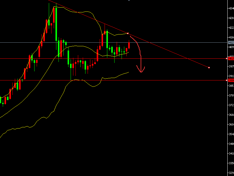 4小时图胶着震荡当中,迂回且反复。并没形成单边趋势,仍在等待月线的形态确认。在短线图收缩震荡反复洗盘的阶段。结合日线图今日靠近了上轨阻力区域。今日短线思路围绕上轨4170-4180附近依旧看空防守放在4200目标看回4100下方4050-4000减个仓再下看。